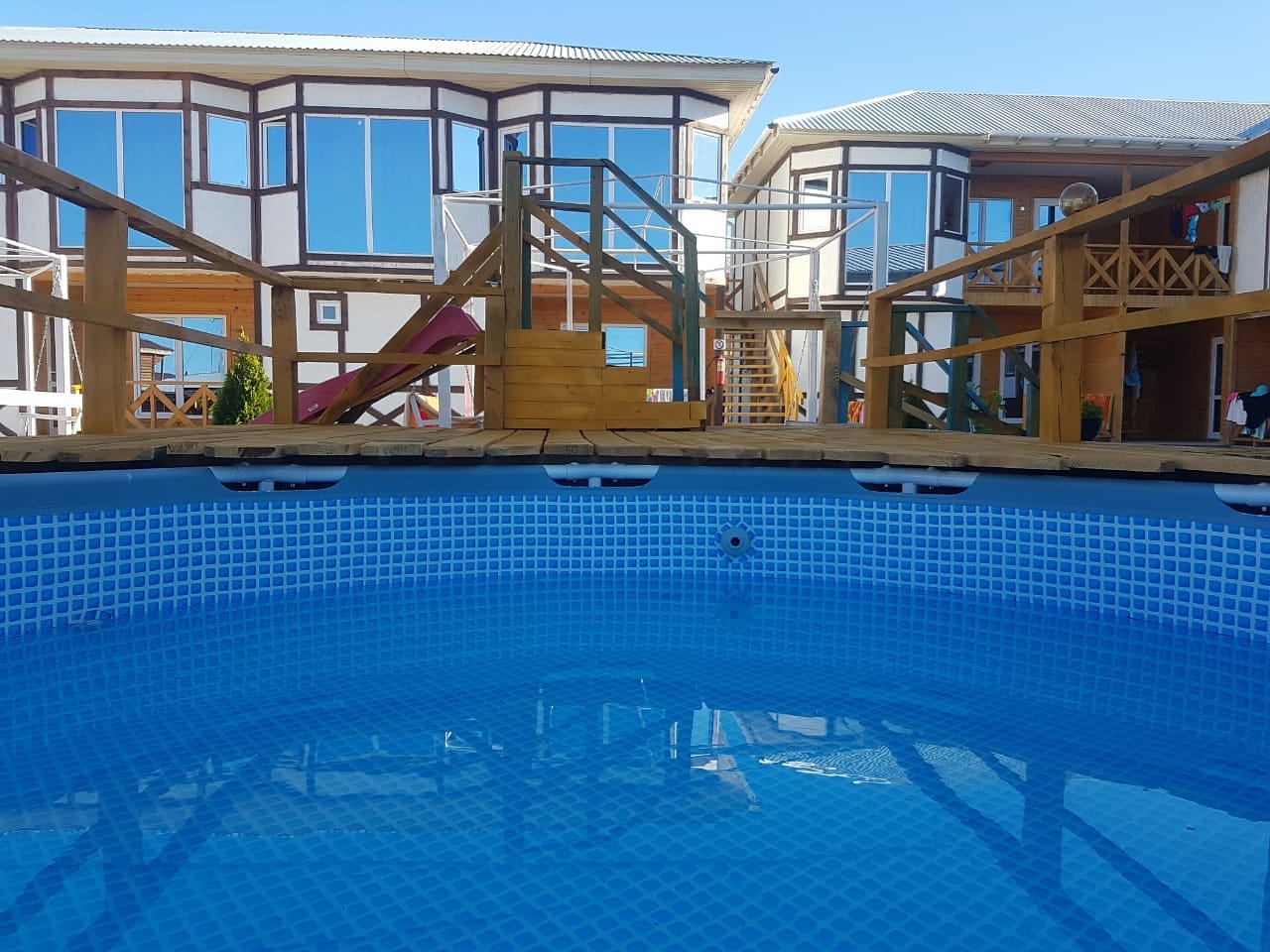 Зелёная благоустроенная территория с детской площадкой и бассейном, столами для настольного тенниса, зоной отдыха со скамейками и лежаками, уютными беседками, столовой и бесплатной парковкой.